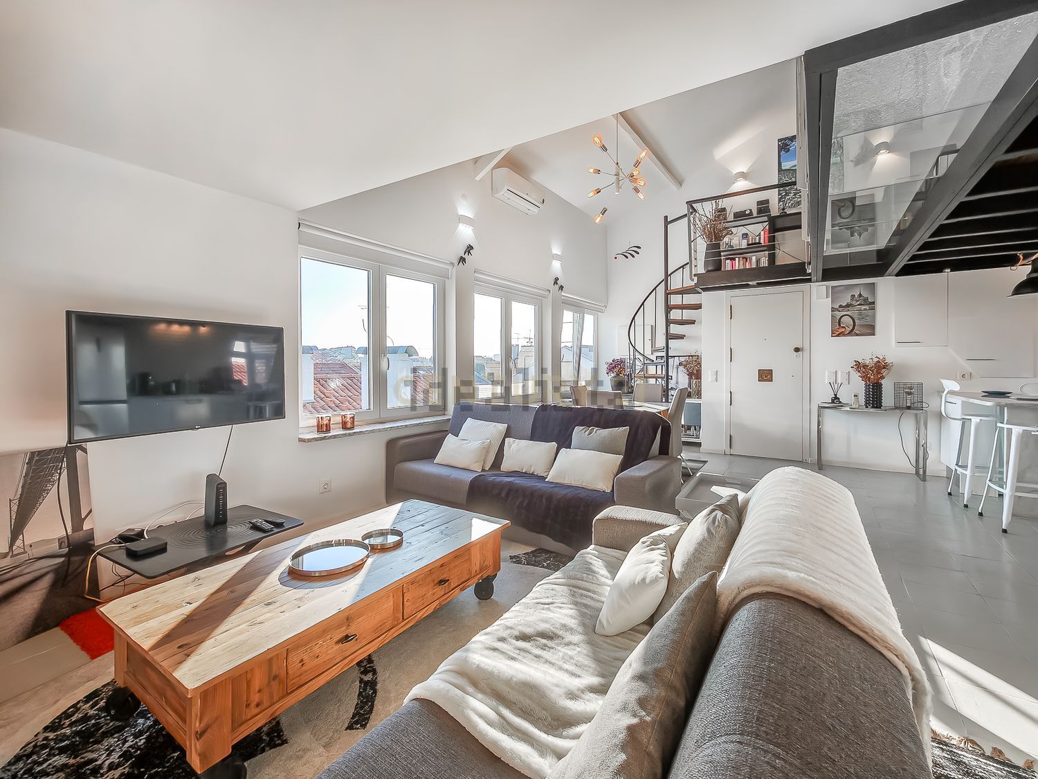 Ce loft climatisé a été intégralement refait à neuf (électricité, plomberie, isolation thermique et acoustique, menuiseries, fenêtres), sous la supervision d’un architecte. Il se distingue par une hauteur sous plafond proche de 5 mètres, offrant une sensation d’espace rare à Lisbonne.