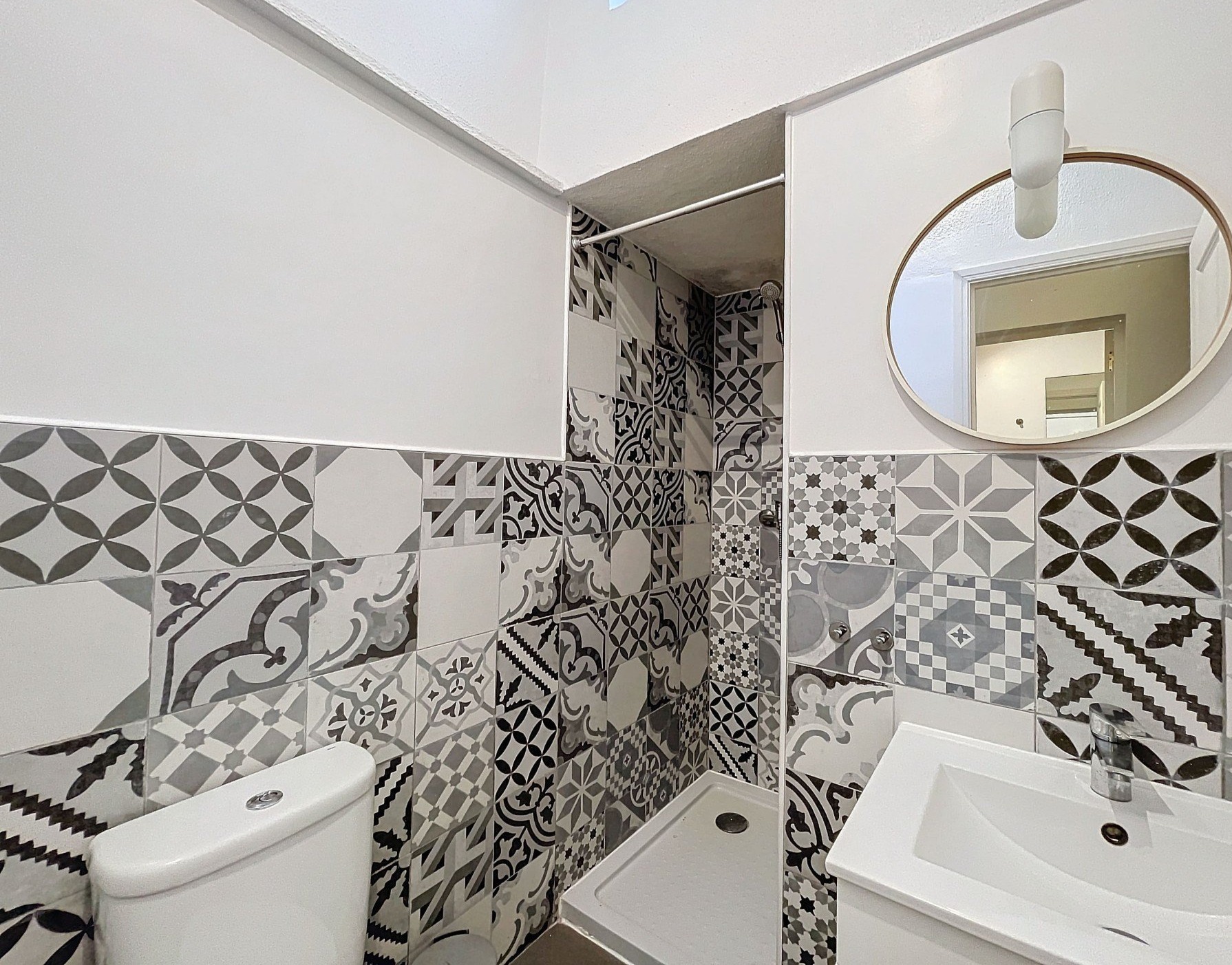 L’appartement se situe au 1er étage d’un immeuble entièrement rénové en 2019 (toiture, façades, plomberie, électricité). Il dispose de deux salles de bain, une chambre principale, deux pièces intérieures et un espace extérieur avec accès par un escalier intérieur.