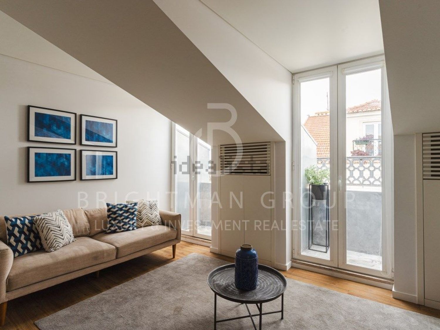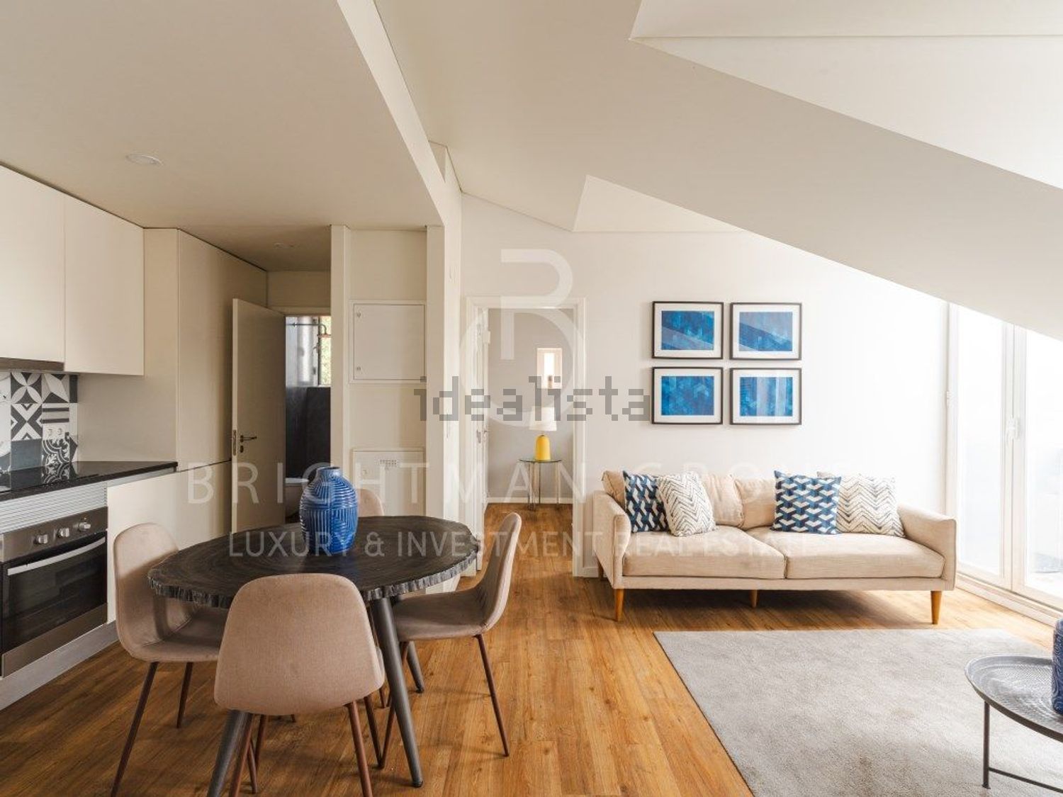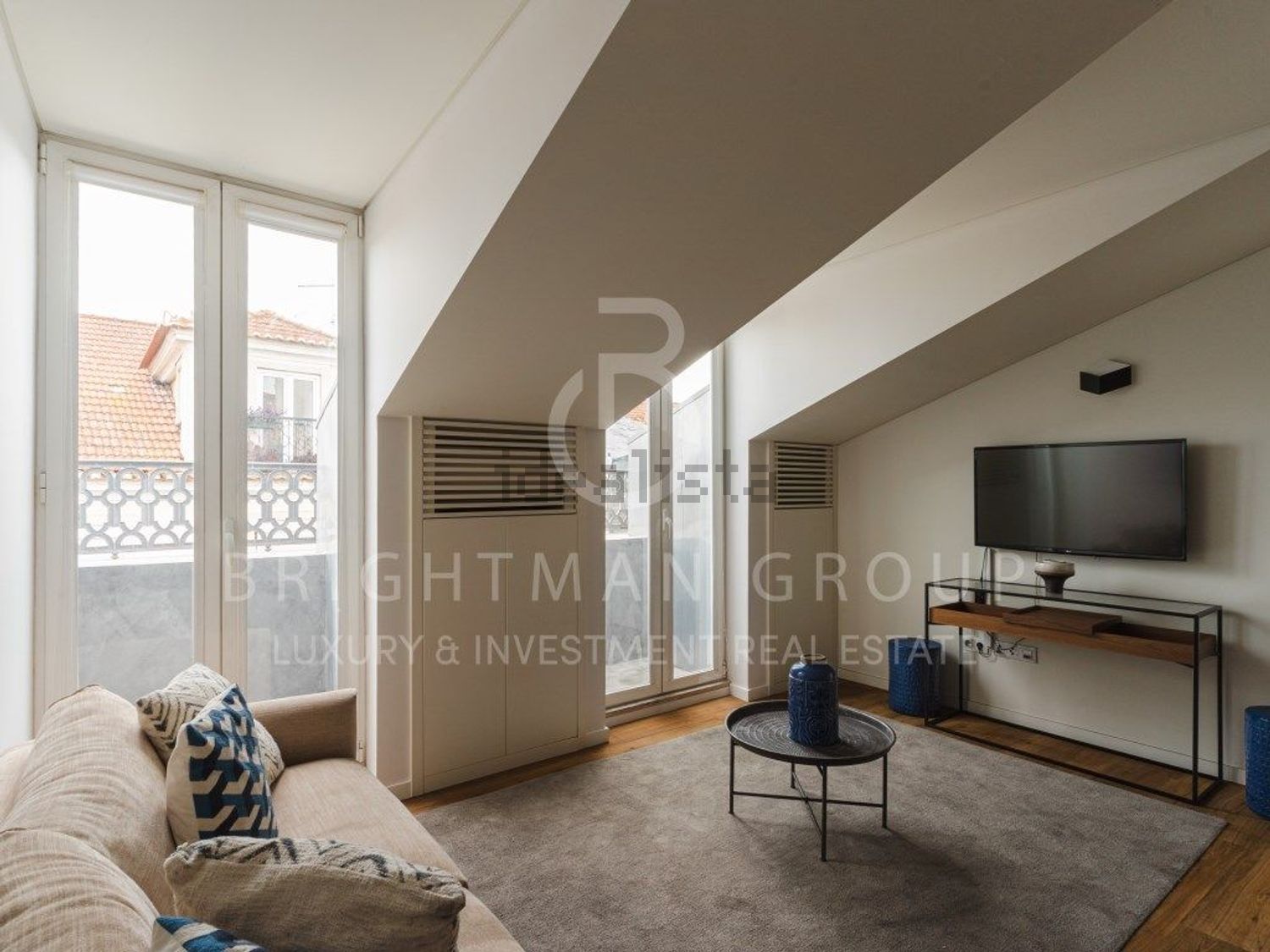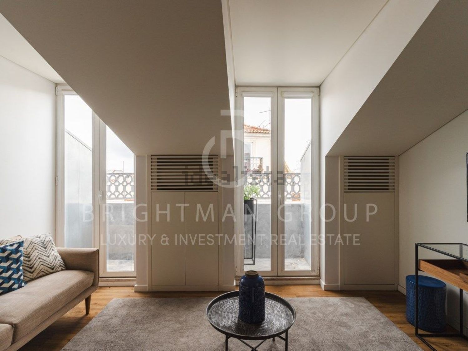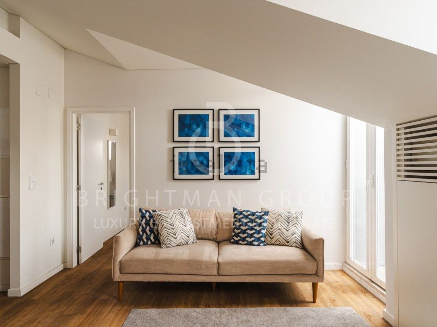 Le séjour spacieux et lumineux, doté de quatre petits balcons, offre une atmosphère chaleureuse et conviviale, idéale pour profiter de la lumière lisboète tout au long de la journée.