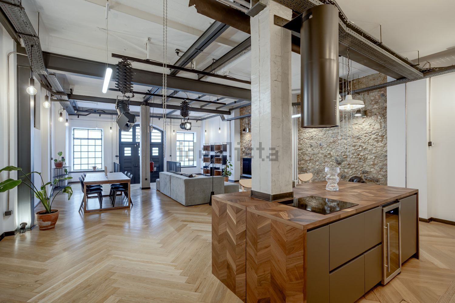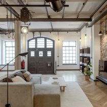 Résultat de la rénovation d’un ancien entrepôt / usine, ce loft conserve les éléments architecturaux industriels originaux : poutres en fer, sols en béton et bois, grandes ouvertures et portes anciennes, tout en intégrant un design contemporain et fonctionnel.